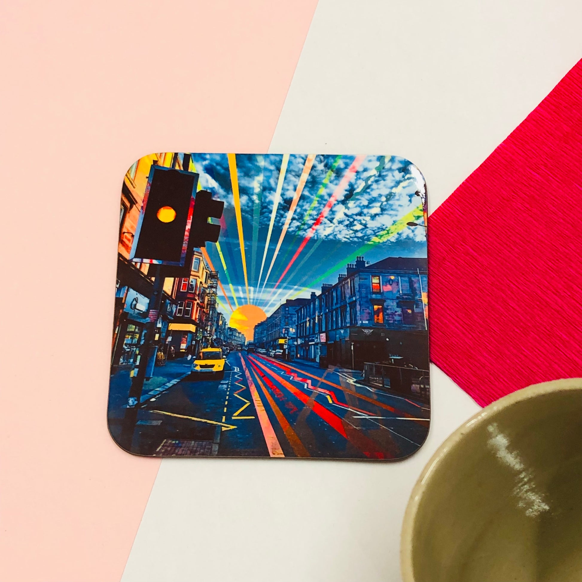 Colourful design transferred to a 8.9cm x 8.9cm rounded edge coaster.