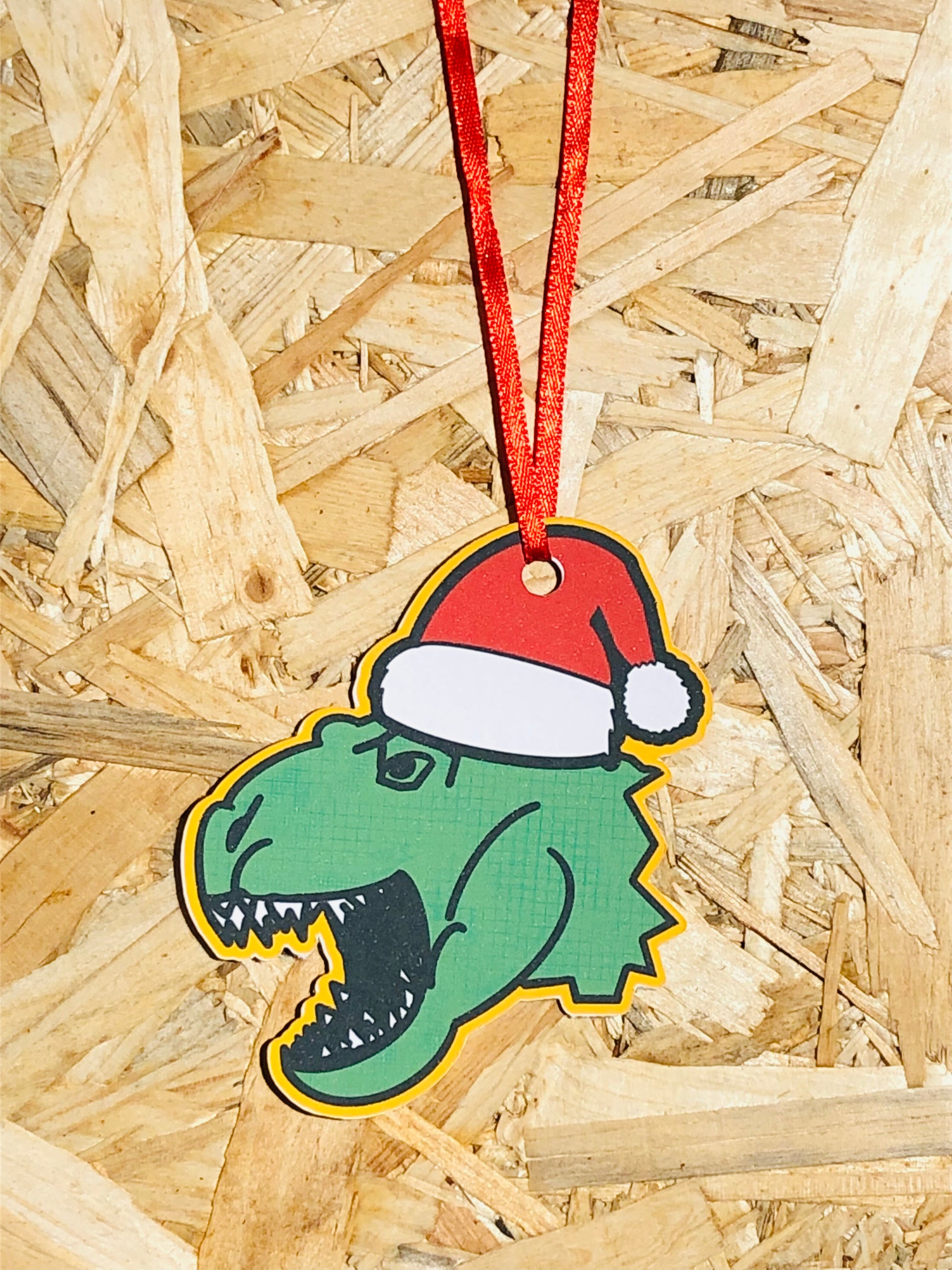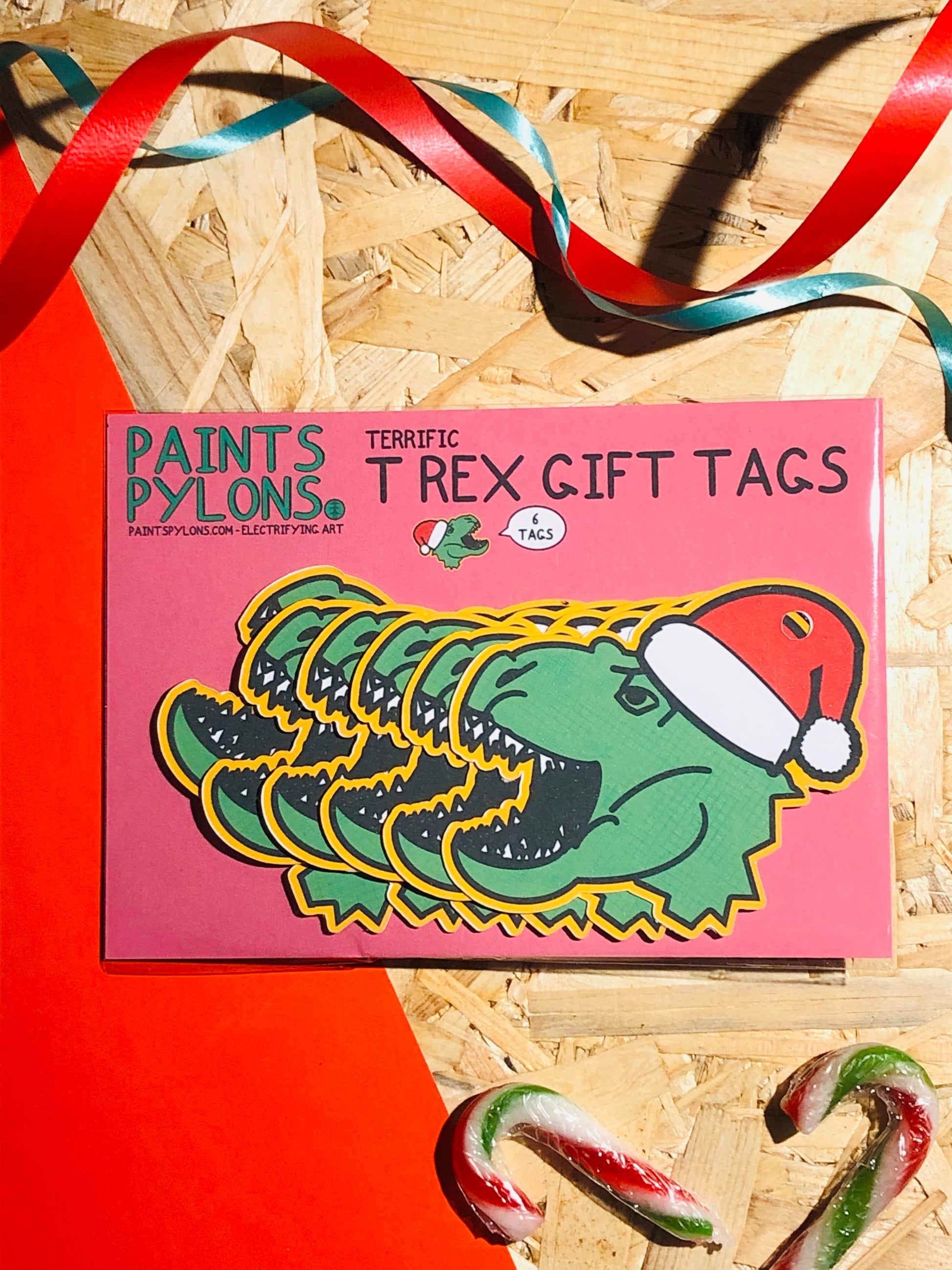 Pack contains - 6 T Rex gift tags, 6 lengths red ribbon